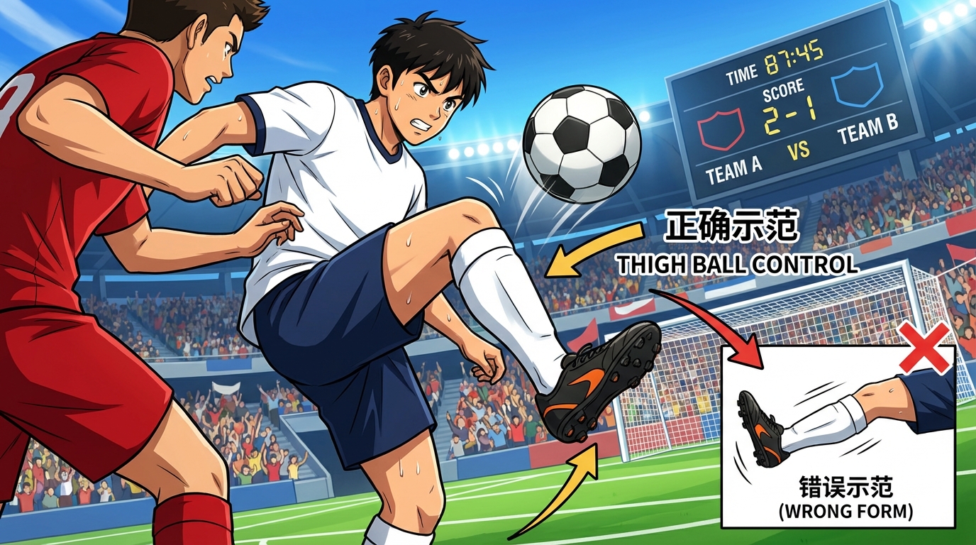 - 垫接控球:大腿保持相对稳定,肌肉适度收紧,将球向上轻垫,为后续处理争取时间。