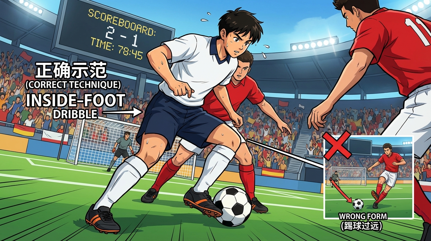 | 球推出去太远,追不上 | 推拨力量过大,步幅过大,重心偏高 | 降低重心,缩小步幅,每一步触球力量要轻柔,保持球在可控范围(约一步距离)内滚动 |